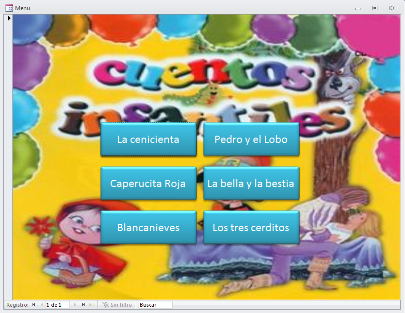 La idea bien sencilla fue crear una pantalla principal con un dibujo de fondo, de los que ella se descarga de internet, y una serie de botones, cada uno de ellos debe abrir otro formulario, con un cuento dentro de un cuadro de texto y, con un fondo también de internet relacionado con el cuento. En esta primera fase nos olvidamos de tablas.